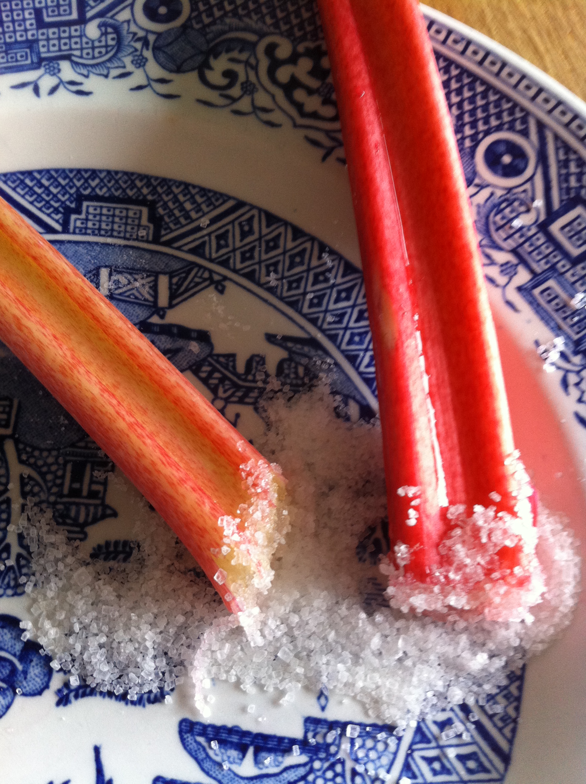 My childhood memory of rhubarb is walking around the garden with a freshly plucked stalk, probably rinsed as it helps the sugar stick for that first bite, and dipping it in a saucer of sugar before each bite. Yum.