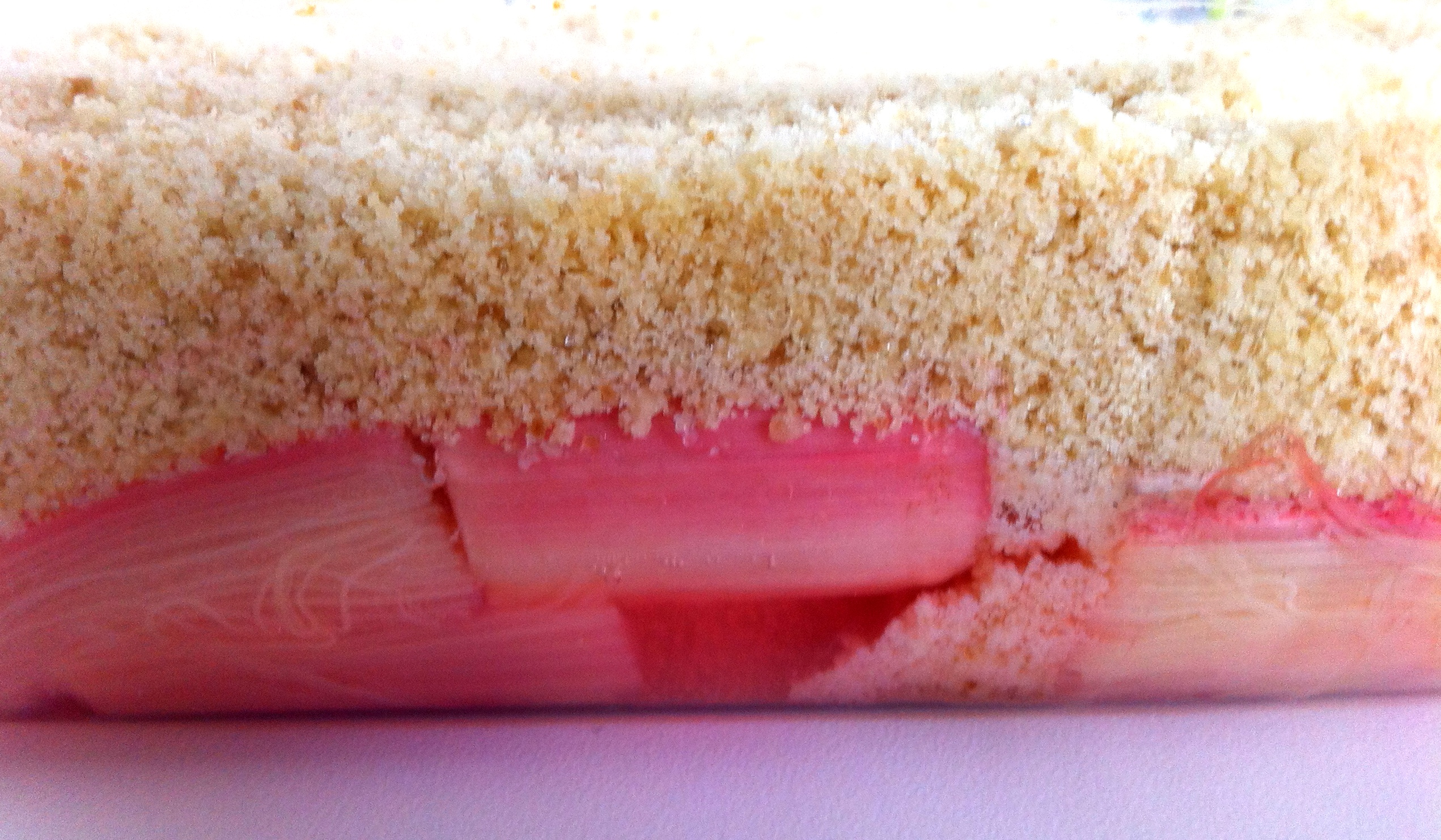 To avoid the rhubarb turning to mush when cooking, bake it in the oven. Pack the cut rhubarb in an ovenproof dish in a single layer, sprinkle with sugar to taste, (try a raw piece to see how much sugar to add, well that is my excuse) add a little liquid (splash of water, orange juice, sweet wine), cover tightly and cook for about 15-20 minutes at 180°c/fan160°C. Leave to cool and firm up before using.