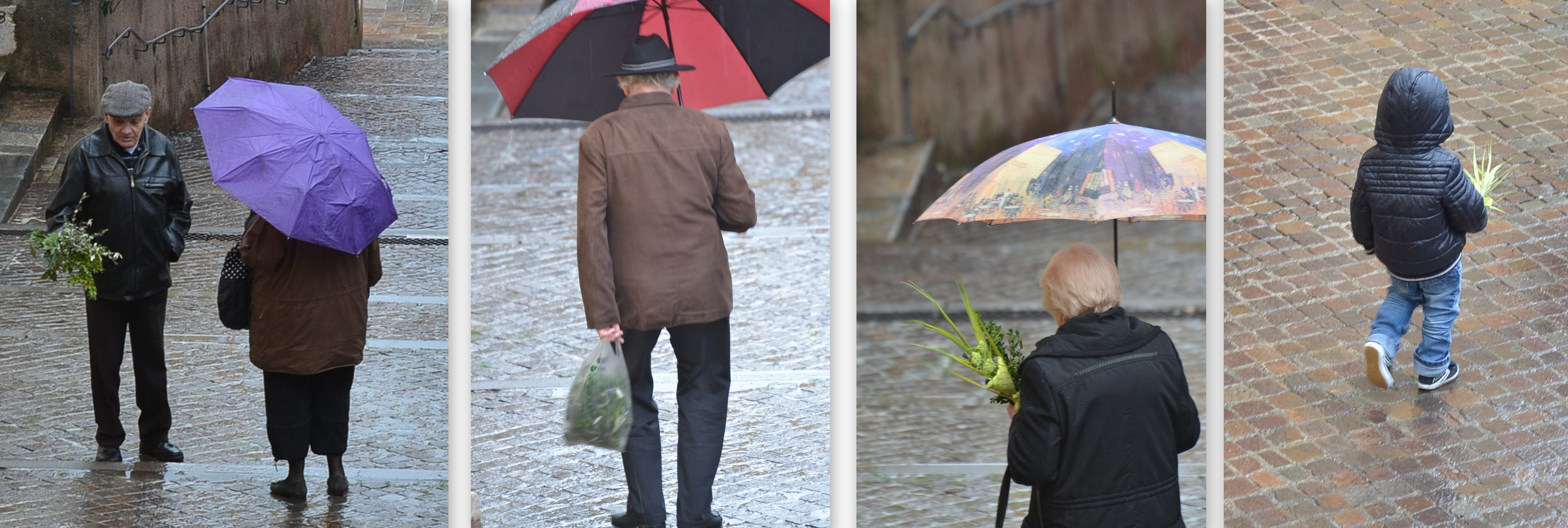 Colourful umbrellas hurry down the stairs to get to church in time. Some are even late, “on est au sud”, we are in the south. Under the umbrellas are mainly elderly people, but every once in a while there will be a young couple or a child holding on to his branches. The odd tourist on this rainy day is a curious bystander. As it happens, they’re an image of the population of the Old Town of Villefranche as a whole: Fewer and fewer as old people pass away, some young people staying, and tourists taking over but not necessarily taking part.
