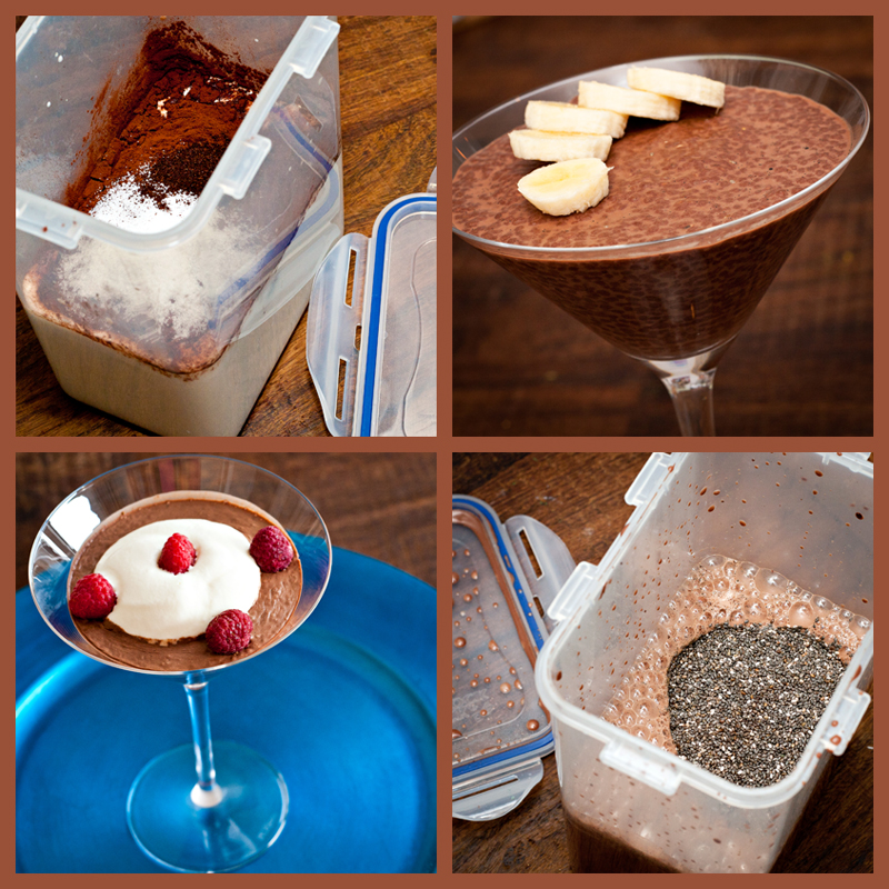 OK, after about 5 minutes go shake the container again really well, and then again after another five minutes. The chia seeds will suck up the fluid and swell up to give this dessert a pudding feeling. Either you leave the pudding in the container in your fridge for another 50 minutes (making it a total of 1 hour soak time) or – and this is the nicer option if you ask me – you divide the pudding into 4 glasses or bowls, and place them in the fridge for the remaining 50 minutes.