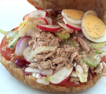 Why not have a picnic and bring pan bagnat? These sandwiches are usually made with a special kind of round bread, but a baguette will do as well. They’re particularly delicious with a glass of rosé in the heat.