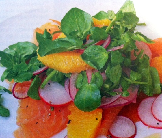 - Divide the smoked salmon between 4 plates. Toss the watercress through the radish mix then put a handful on top of the salmon, making sure you have a bit of everything. Serve with any juices from the bowl poured over.